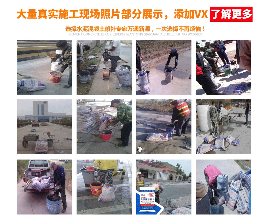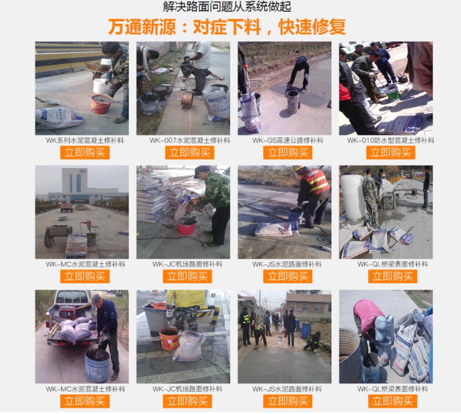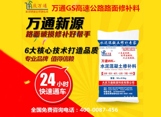 大慶萬通新源科技有限公司獨有的混凝土路面高強速補料,是水泥混凝土路面病害修復的好材料。疲勞、凍融循環(huán)、彎曲壓力、滲水和基層破壞等原因都會引起水泥路面的破損,從而帶來高昂的維護費用。與以往的剛性修補方法不同,混凝土水泥路面維修速補膠提供了一種獨特的柔性修補產(chǎn)品和技術(shù),高柔性、高抗拉性,可跨伸縮縫施工和高抗壓性使得混凝土快補產(chǎn)品為水泥混凝土路面提供了******性的修補。傳統(tǒng)的剛性修補方案,如環(huán)氧砂漿和快干水泥產(chǎn)品,由于其自身的粘結(jié)失效,抗疲勞性低以及與原路面不同的伸縮系數(shù),修補面會在短時間內(nèi)失效或產(chǎn)生新的裂縫,需要反復修補,有效期短且費用高昂。大慶萬通新源科技有限公司的混凝土水泥路面維修速補膠可以隨原路面一起伸縮,移動,從而避免了粘結(jié)失效和產(chǎn)生新裂縫。萬通快補產(chǎn)品優(yōu)異的粘結(jié)性、柔韌性和高防滑性,特別適用于水泥路面的淺層粘合修補,多邊角混凝土板層修補,跨伸縮縫修補以及路面沉陷修補。萬通混凝土病害修補料針對混凝土起皮起沙、斷板裂縫、蜂窩麻面、坑槽露石子、漏筋掉皮、橋梁的掉皮漏筋快速通車使用時間長。應用萬通快補產(chǎn)品,施工后一天就可以恢復交通。大慶萬通新源科技有限公司的萬通水泥路面維修速補膠適用于高速公路、機場路面、農(nóng)村村村通路面、廠坪、學校操場、市區(qū)公路、小區(qū)路面、橋梁、水泥路面的修補。使用萬通特快補材料修補路面可以一勞永逸! 水泥地面起砂怎么辦,混凝土修補劑混凝土地面起砂,混凝土地面修補,地面起砂怎么辦,